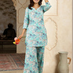 Cotton Hip Length Printed Straight 3/4 Sleeves Round Kurta Suit Set