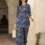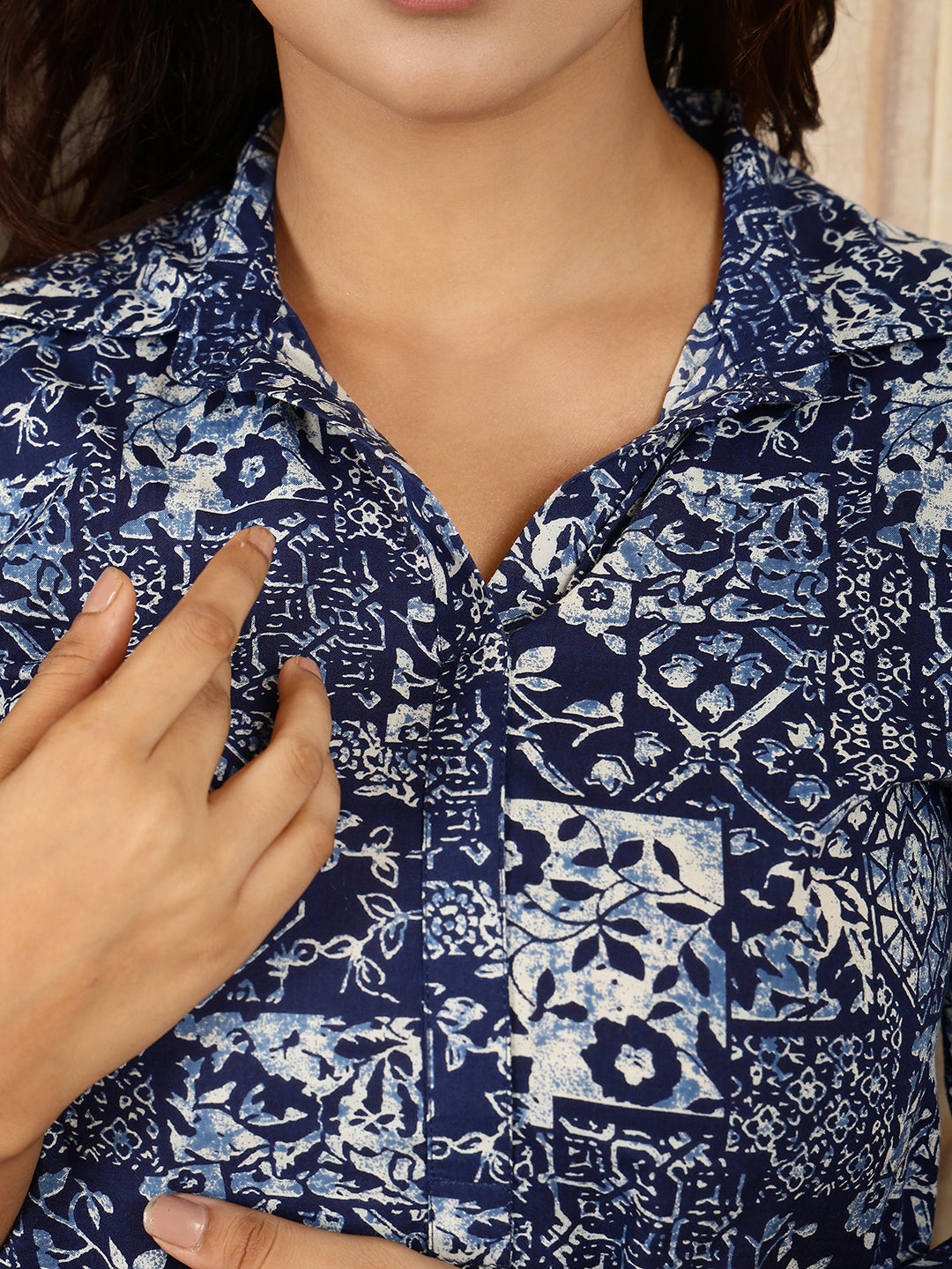 Cotton Hip Length Printed Straight 3/4 Sleeves Shirt Coller Kurta Suit Set