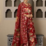 Cotton Calf Length Printed Flared 3/4 Sleeves V Neck Kurta, Bottom With Dupatta