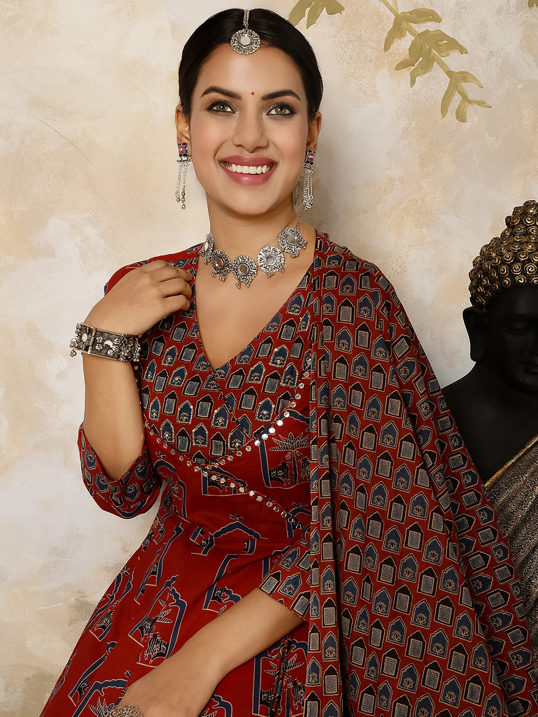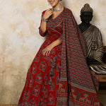 Cotton Calf Length Printed Flared 3/4 Sleeves V Neck Kurta, Bottom With Dupatta