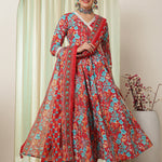 Cotton Calf Length Printed Flared 3/4 Sleeves V-Neck Kurta Suit Set