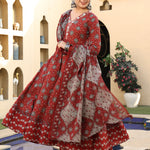 Cotton Calf Length Printed Flared 3/4 Sleeves V-Neck Kurta Suit Set