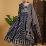 Cotton Calf Length Printed Flared 3/4 Sleeves V-Neck Kurta Suit Set