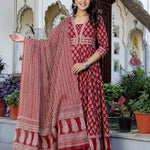 Cotton Calf Length Printed Flared 3/4 Sleeves V-Neck Kurta Suit Set