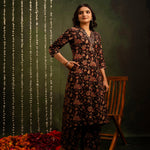 Cotton Calf Length Printed A-Line 3/4 Sleeves V-Neck Kurta Bottom Set