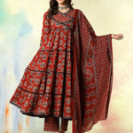 Cotton Calf Length Printed Flared 3/4 Sleeves V-Neck Kurta Suit Set