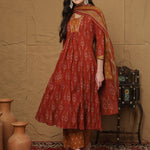 Cotton Calf Length Printed 3/4 Sleeves Collar Semi-Flared Kurta Bottom With Dupatta