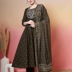 Cotton Calf Length Printed 3/4 Sleeves Round Neck Semi-Flared Kurta Suit Set
