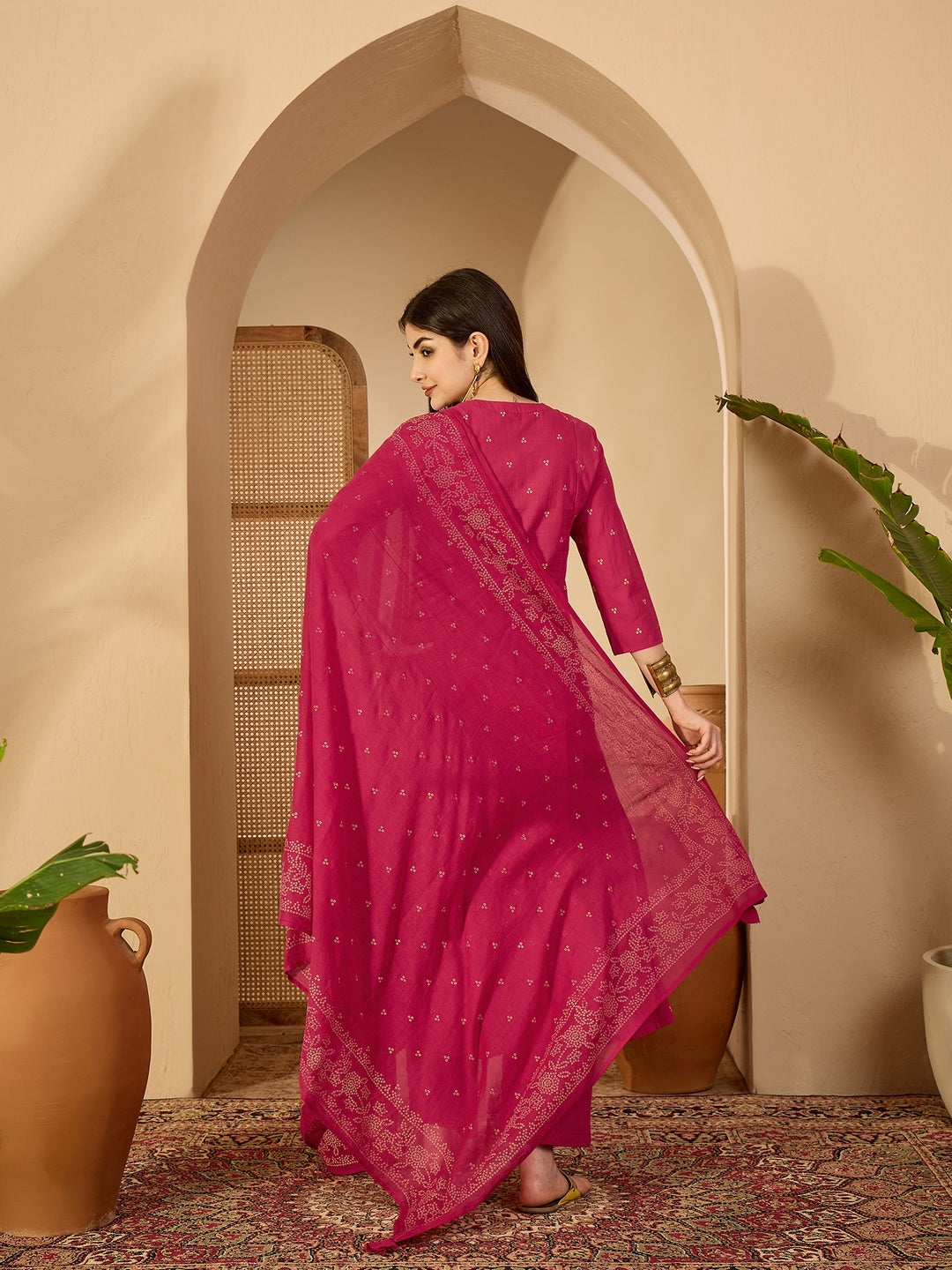 Cotton Calf Length Printed 3/4 Sleeve Round Neck Flared Kurta Suit Set