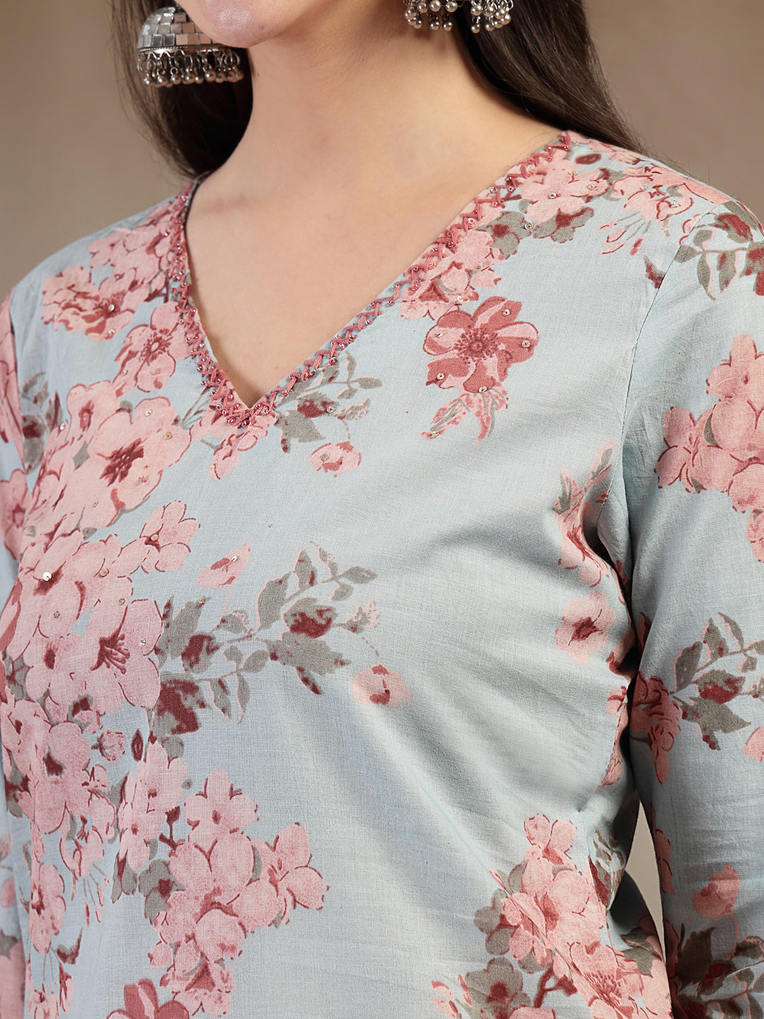 Cotton Calf Length Printed 3/4 Sleeves V-Neck Straight Kurta Suit Set With Dupatta