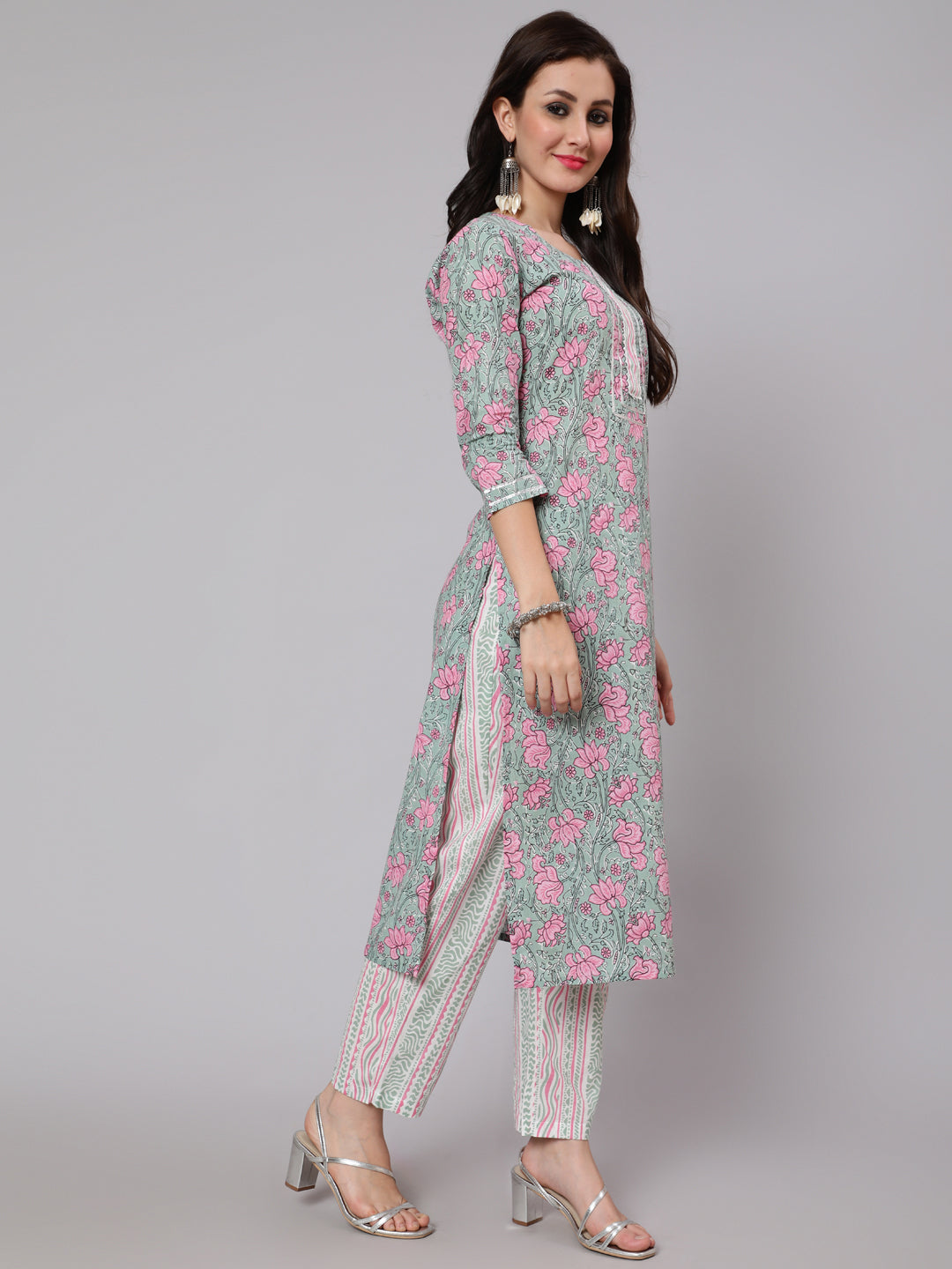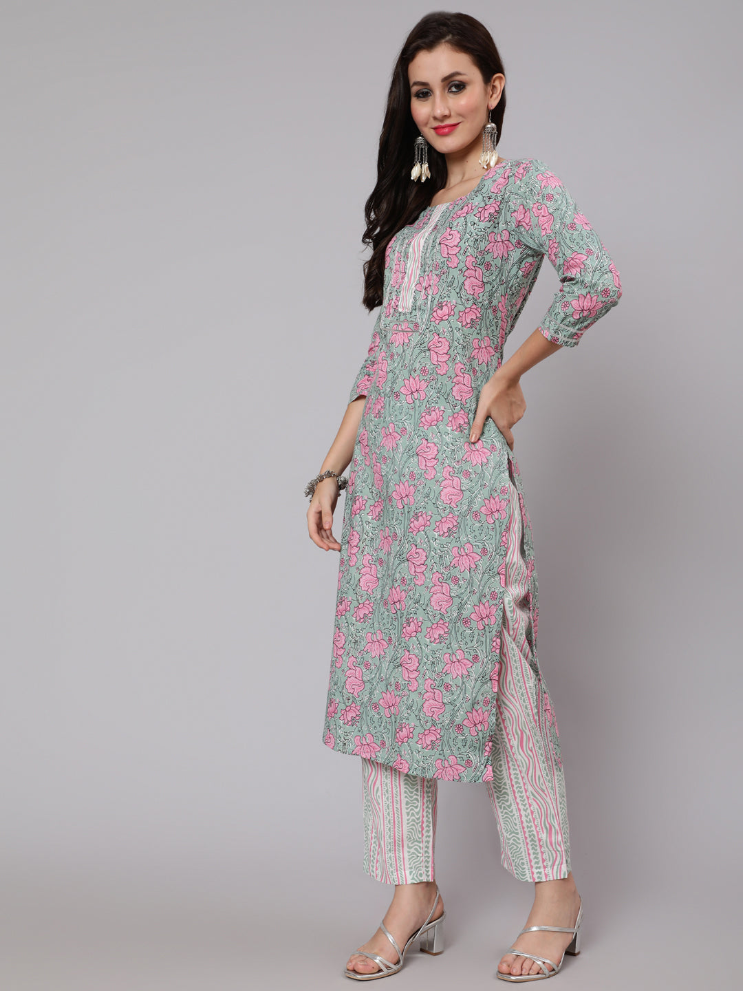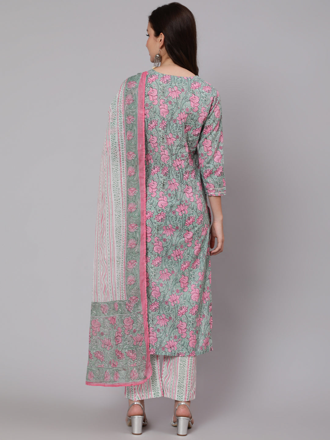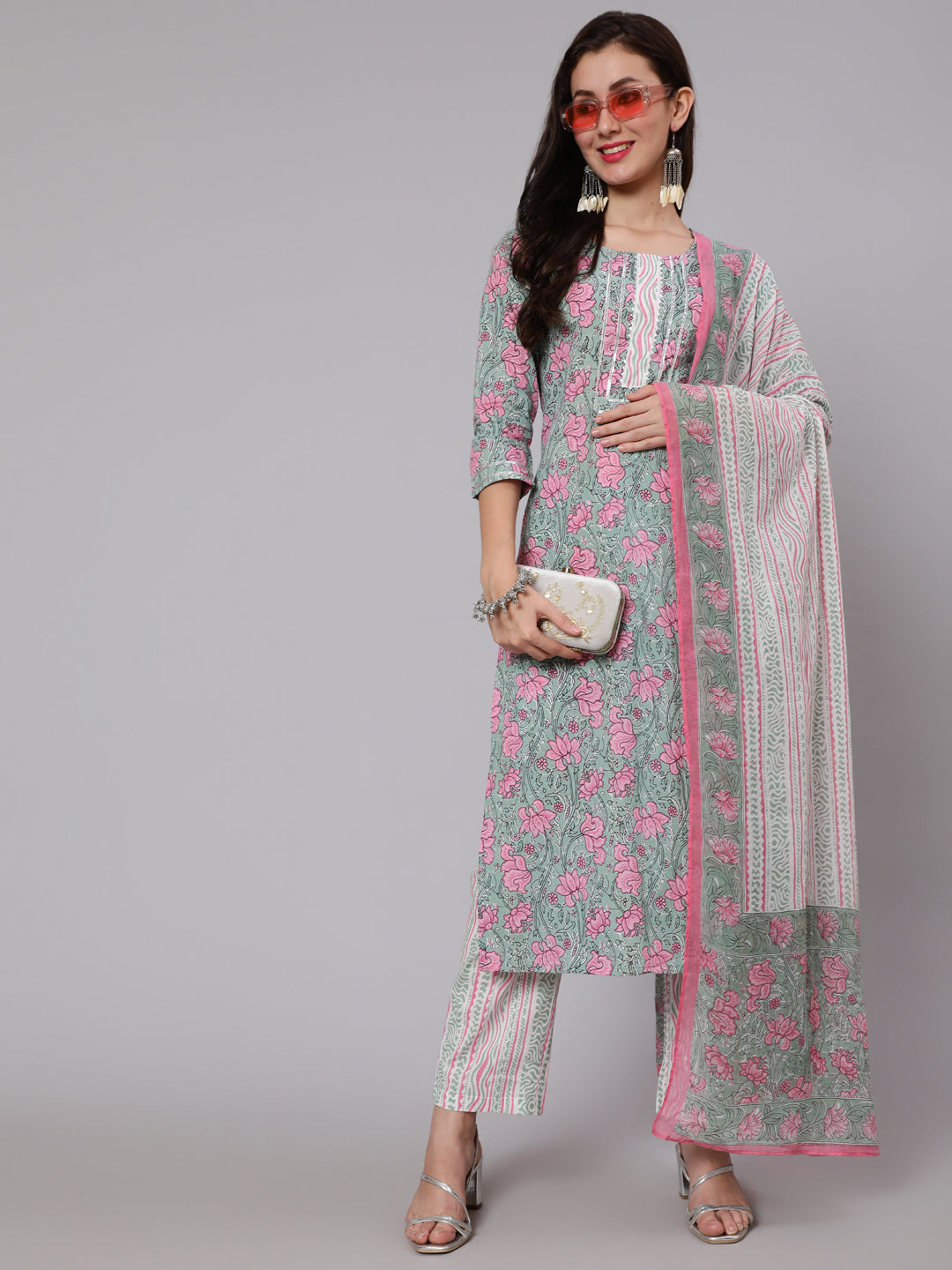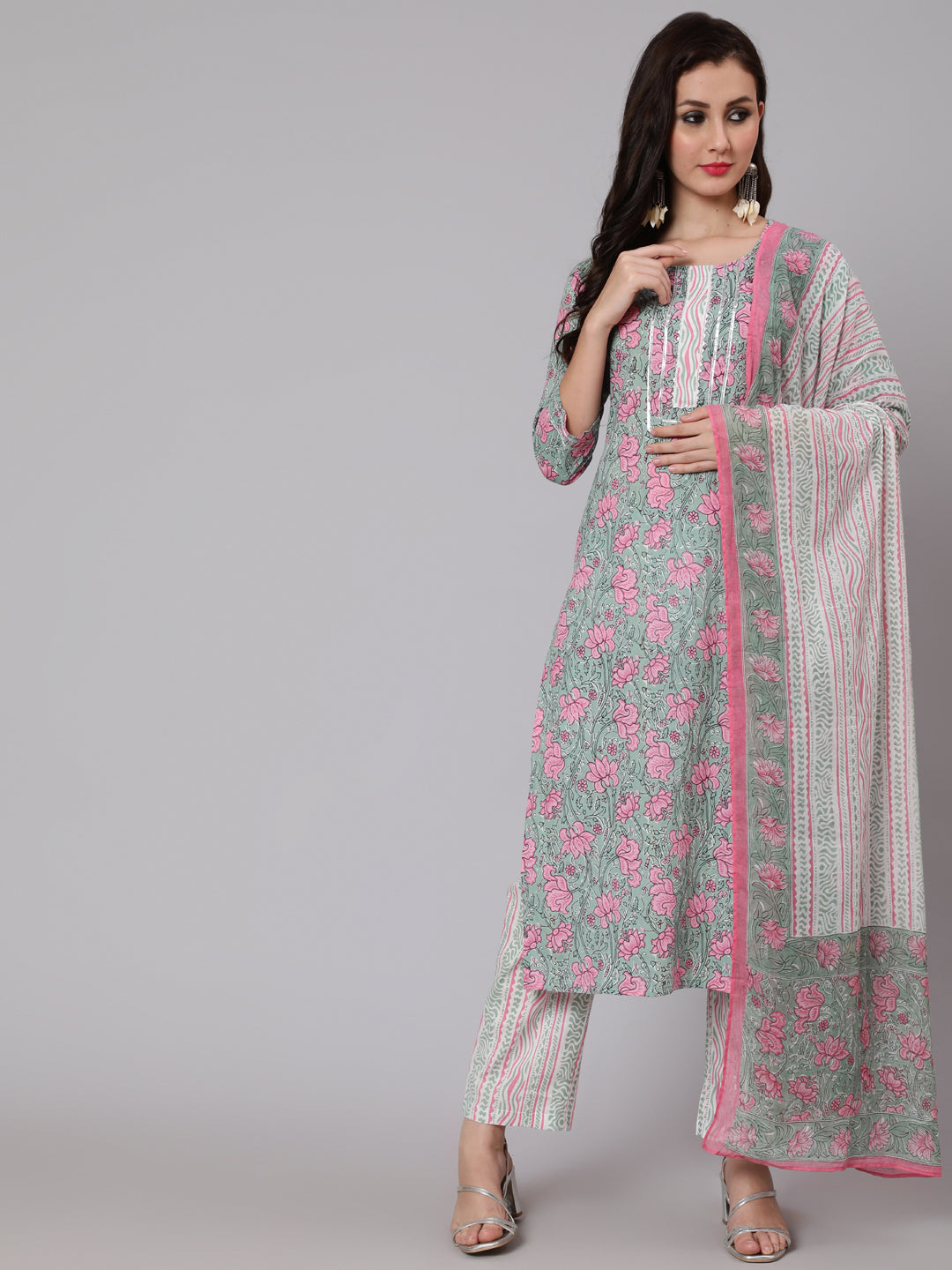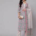 Cotton Printed Round Neck 3/4 Sleeve Straight Calf Length Ethnic Kurta Pants With Dupatta Set