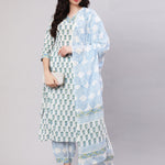 Rayon Printed Ankle Length Flared 3/4 Sleeve Round Neck Kurta, Pants With Dupatta Set