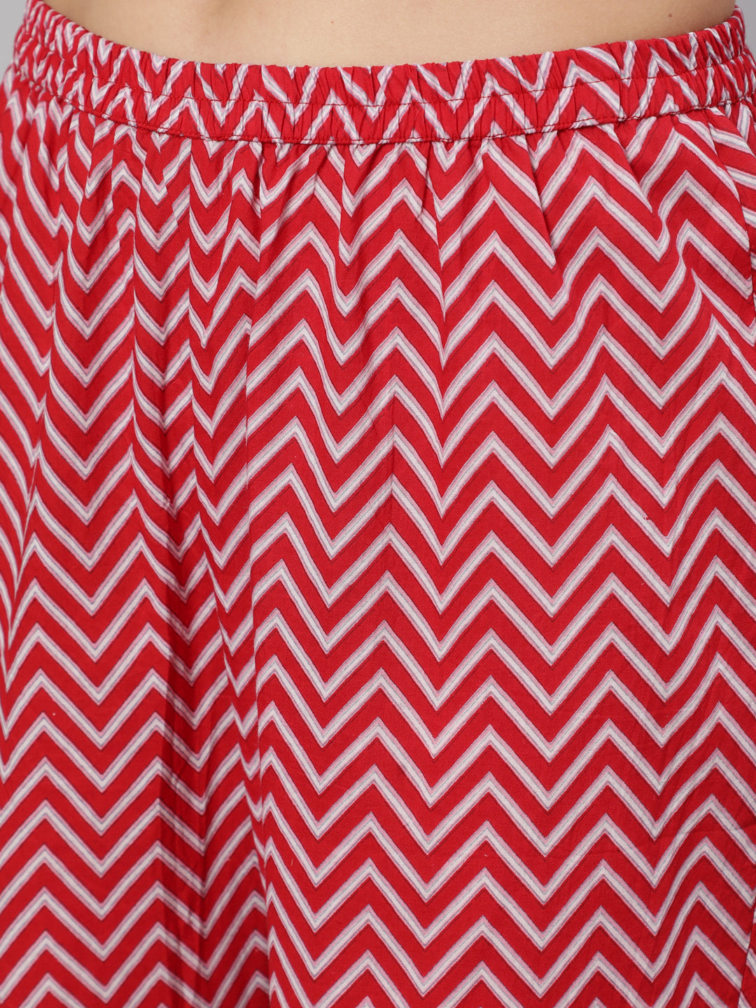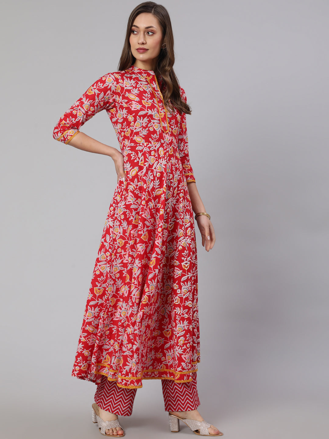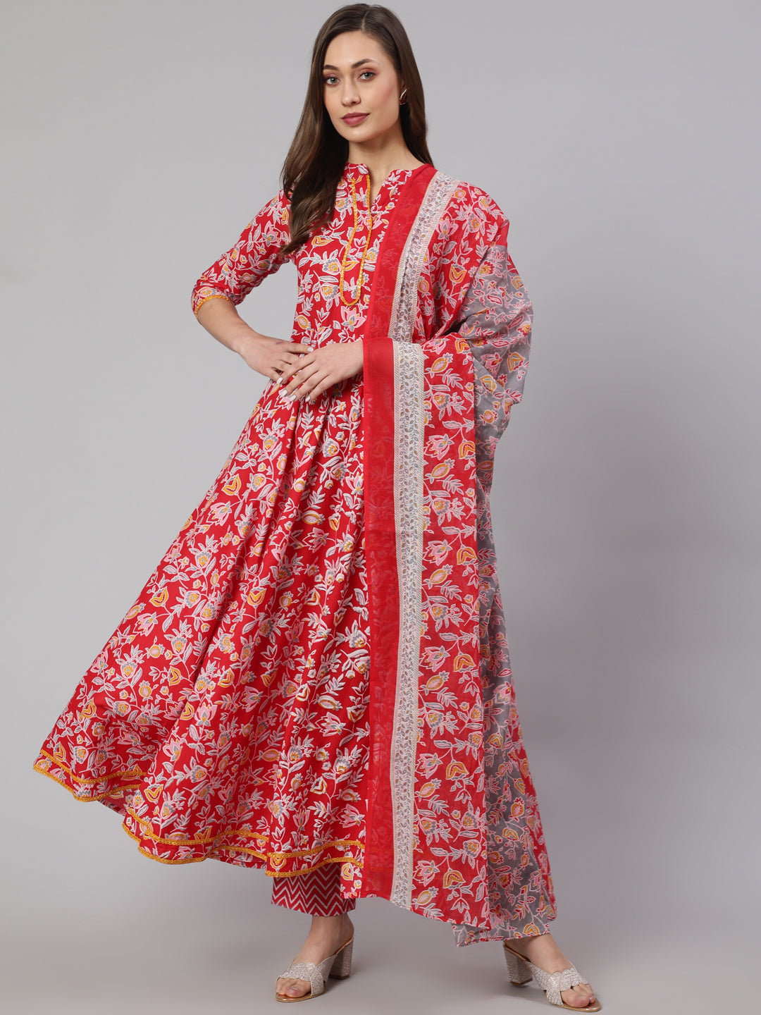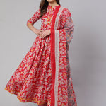 Cotton Printed Ankle Length Flared 3/4 Sleeve Mandarin Neck Kurta, Pants With Dupatta Set