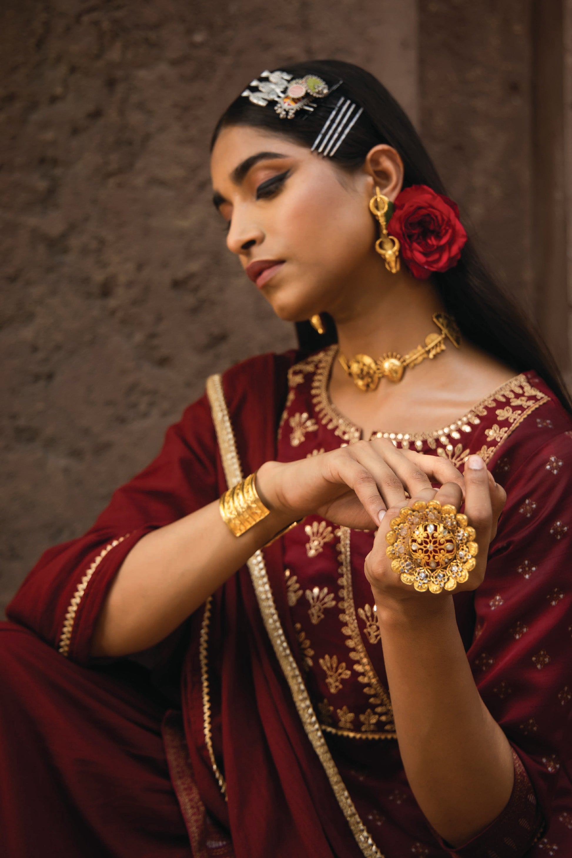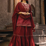 Maroon Satin Slub Festive Embroidered Printed Straight Kurta Skirt Dupatta Set