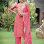 Pink Chanderi Festive Embroidered Placement Printed Straight Kurta Set