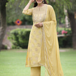 Mustard Chanderi Festive Embroidered Placement Printed A-line Kurta Set