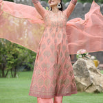 Peach Chanderi Festive Embroidered Floral Print Flared Kurta Set