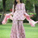 Pink Muslin Festive Wear Mirror Work Straight Kurta Sharara Dupatta Set