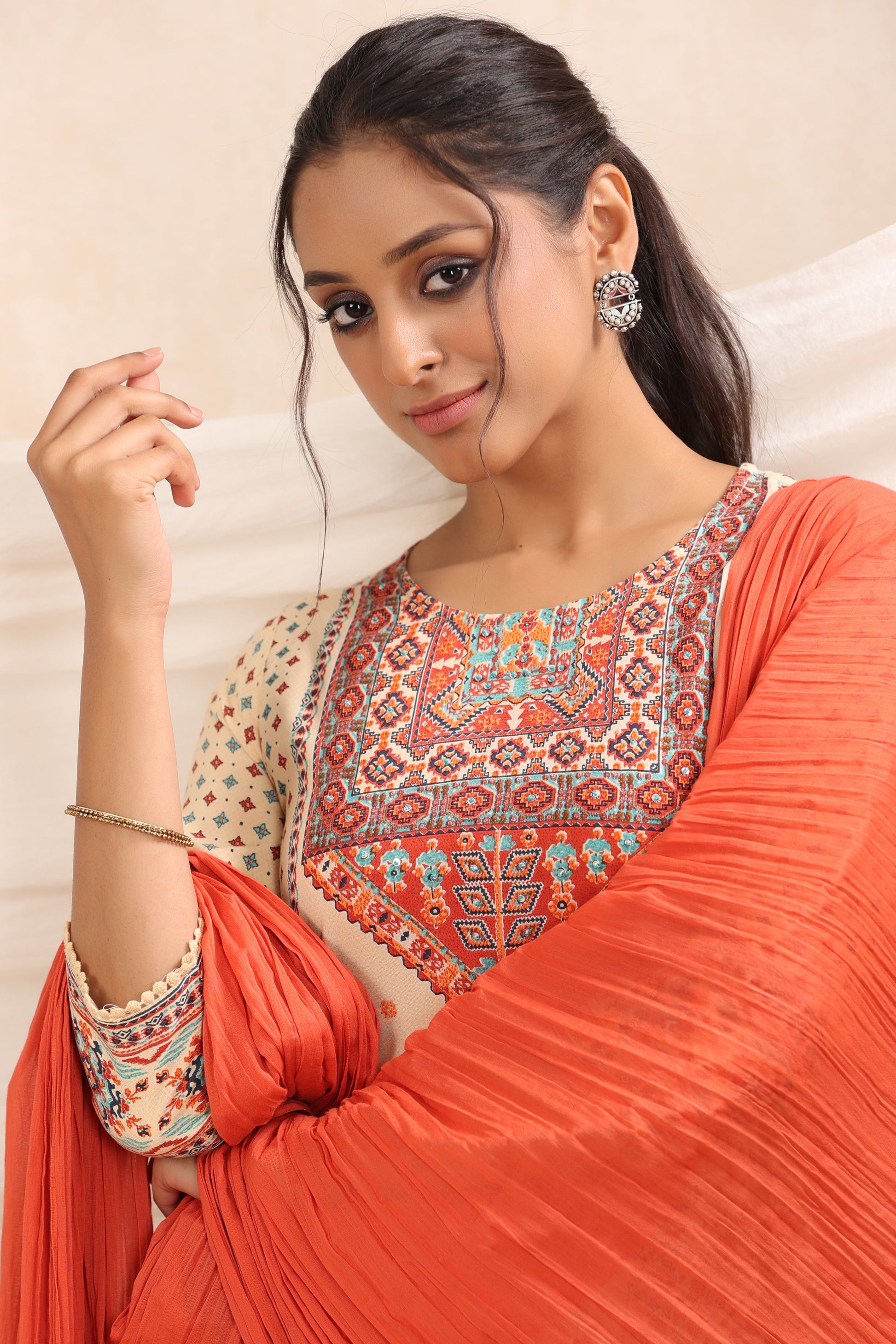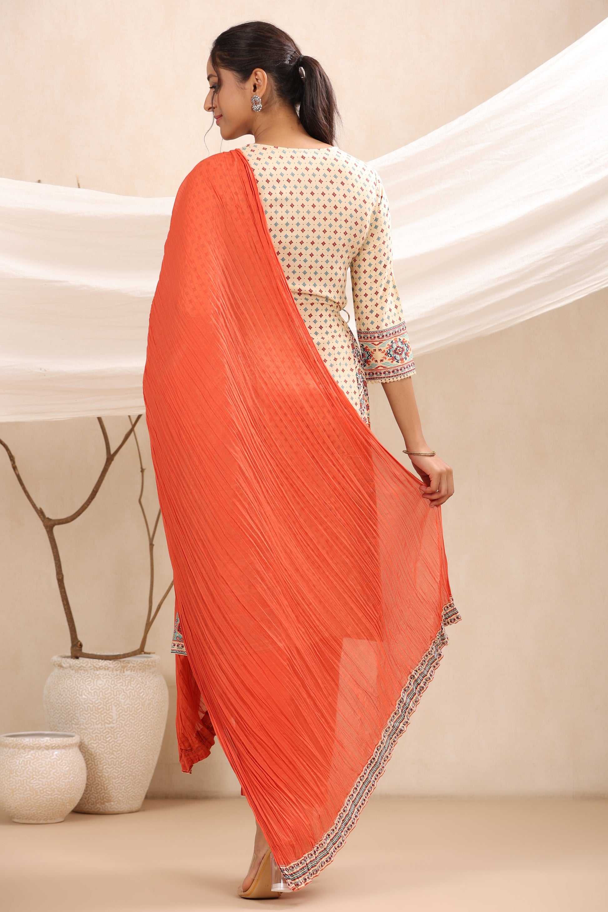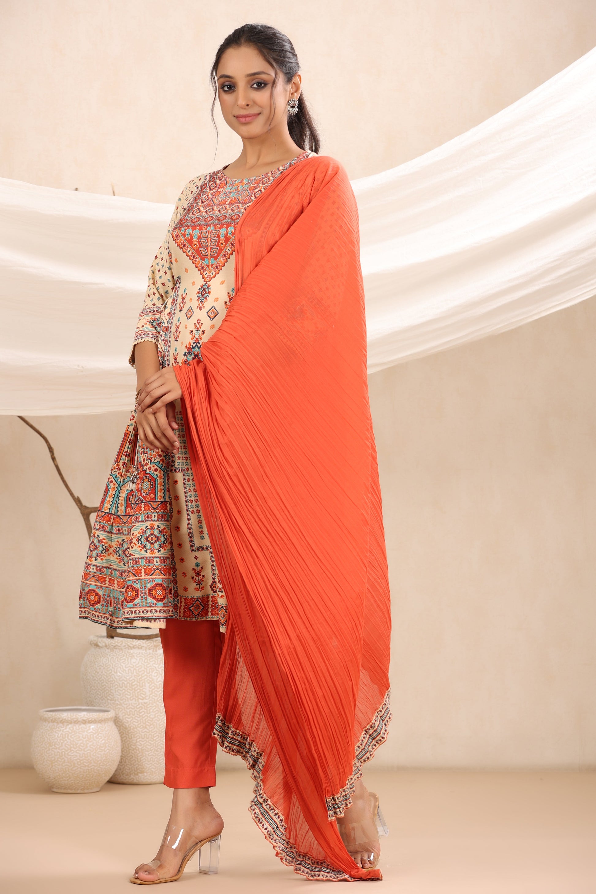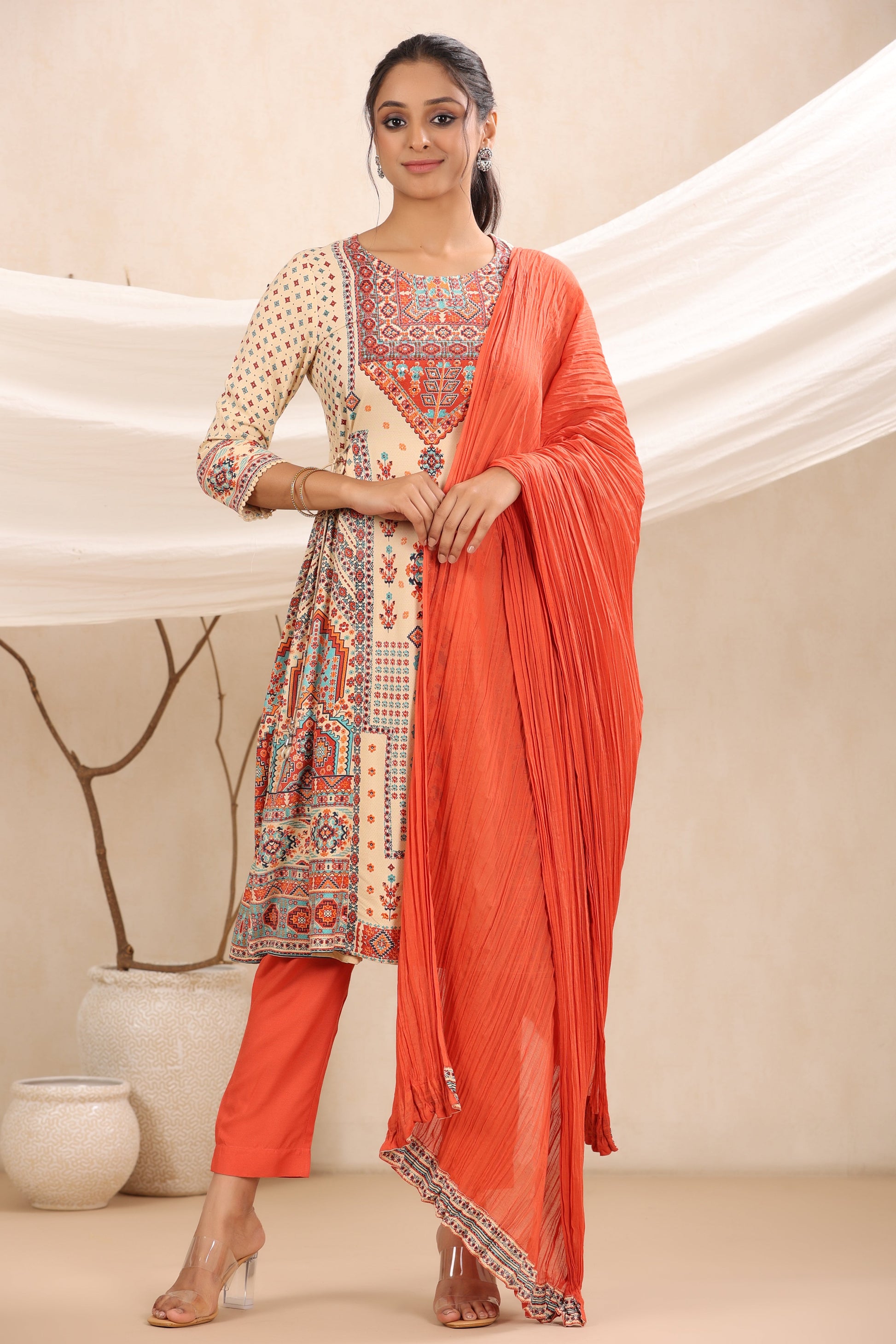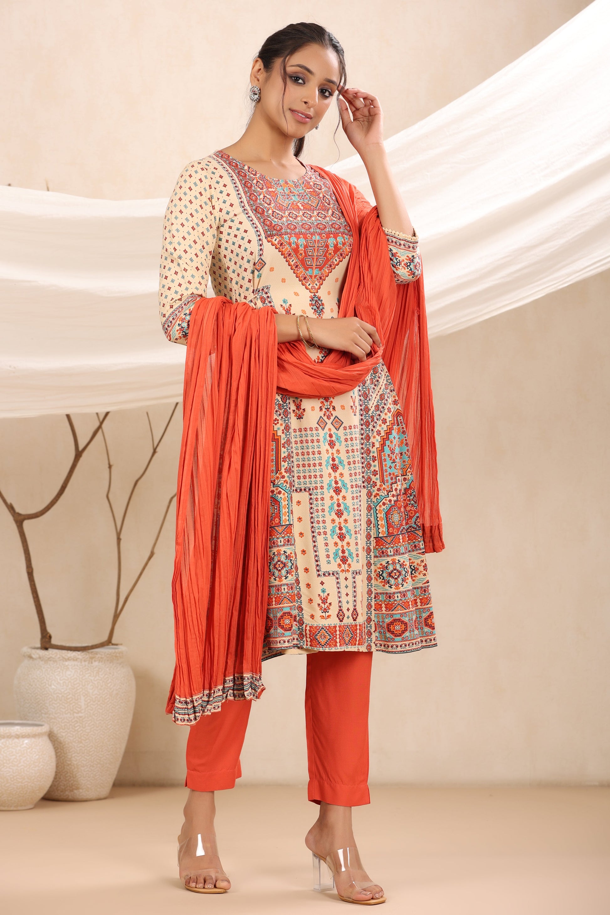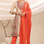 Off - White Rayon Festive Printed A-Line Skd