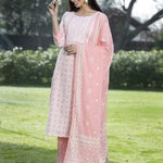Peach Cotton Embroidered Straight Kurta Pant Dupatta Set