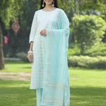 Powder Blue Cotton Embroidered Straight Kurta Pant Dupatta Set