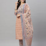 Peach Cotton Embroidered Straight Kurta Pant Dupatta Set