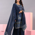 Indigo Cotton Cambric Printed Kurta, Palazzo And Dupatta Set