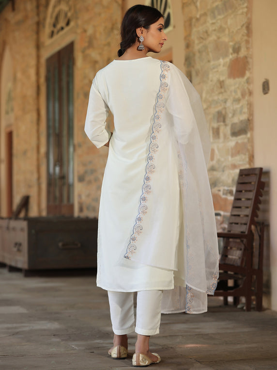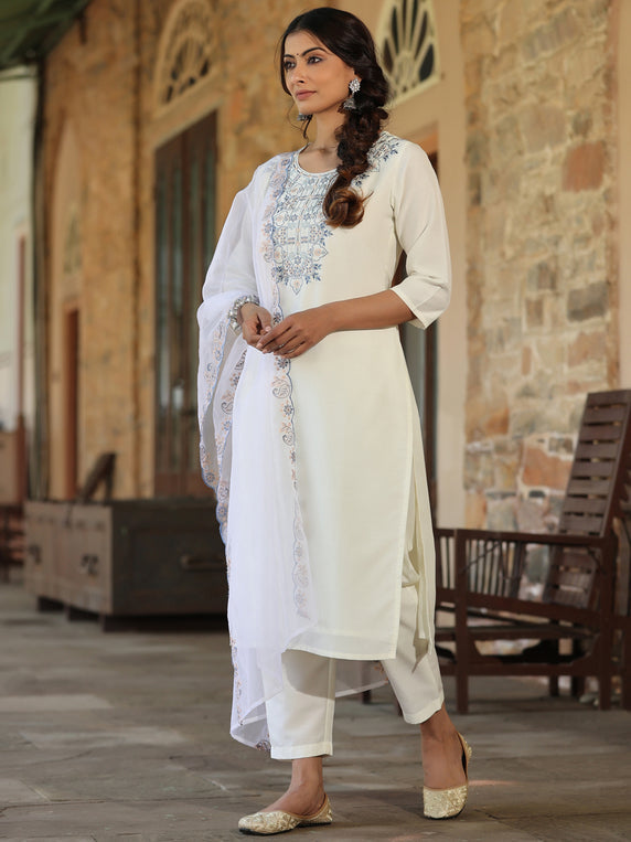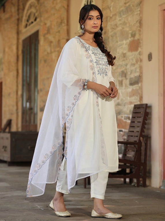 White Chinnon Solid Embroidered Kurta Set