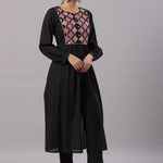 Black Cotton Dobby Solid With Embroidery Flared Kurta Sets
