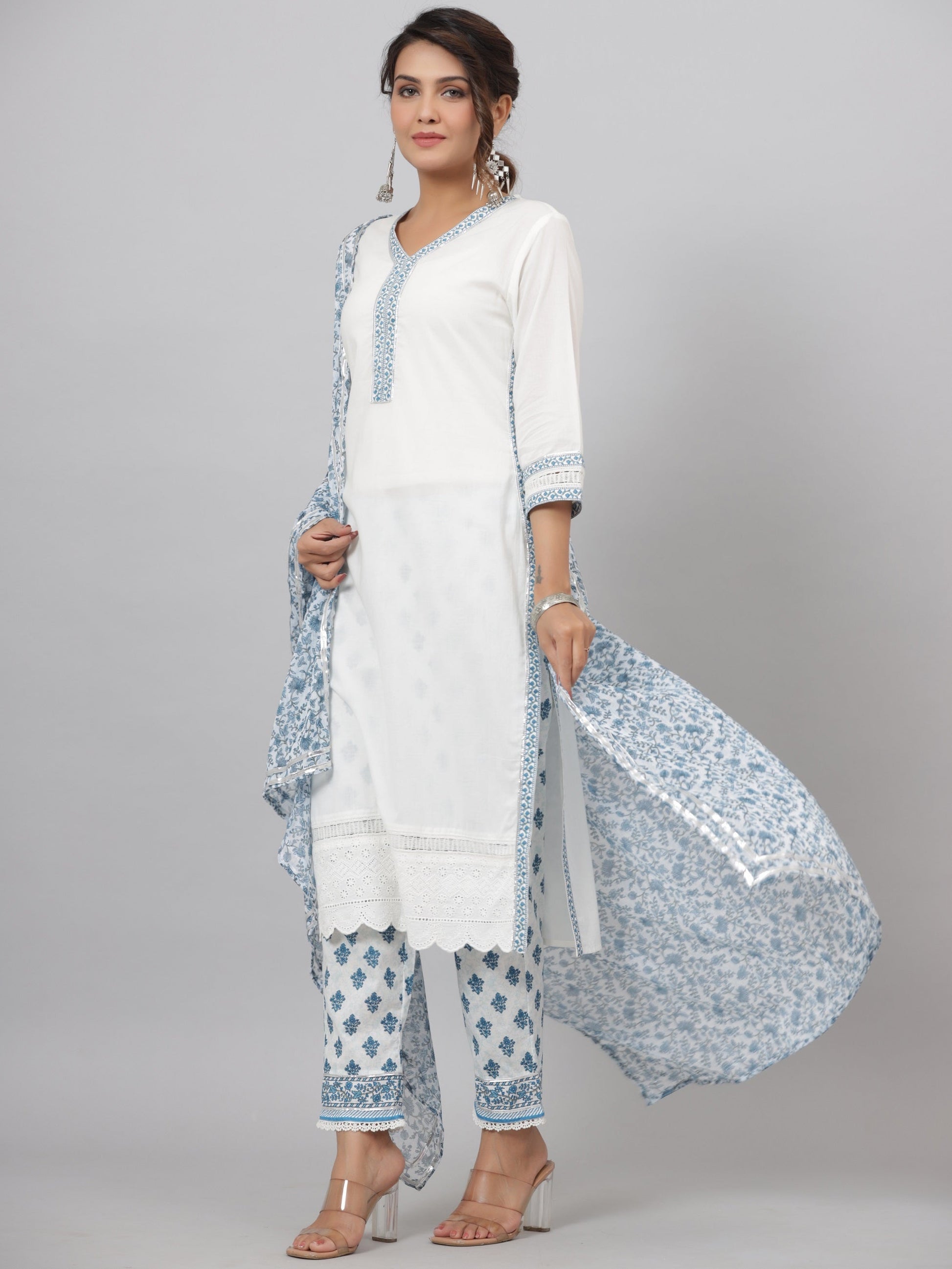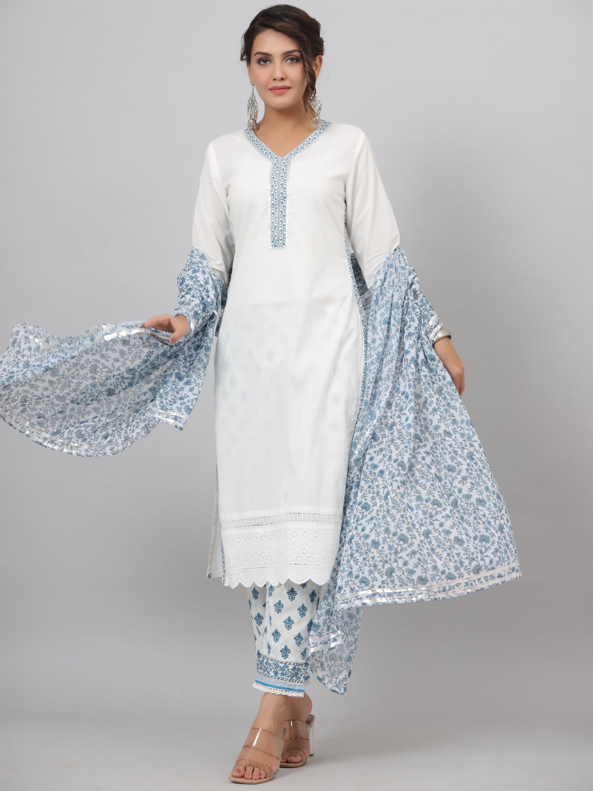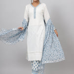 White Cotton Cambric Solid Kurta Floral Printed Pant & Dupatta Set