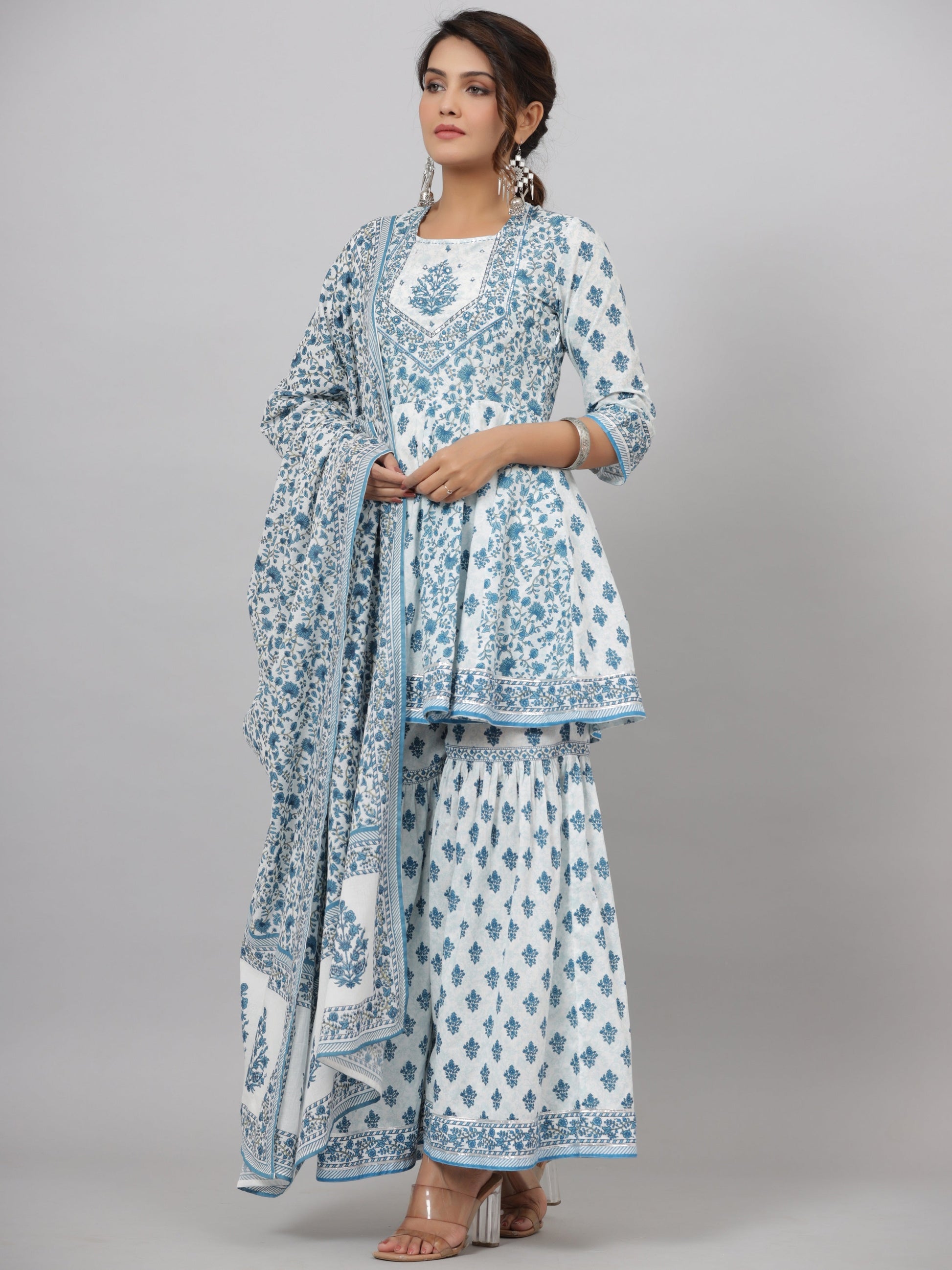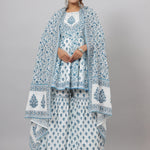 Blue Cotton Cambric Floral Placement Printed Anarkali Kurta Sharara & Dupatta Set