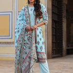 Skyblue Cambric Floral Placement Printed Straight Fit Kurta Sets