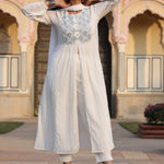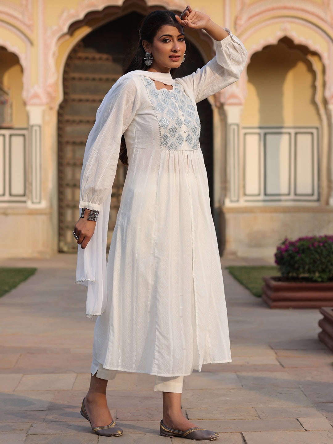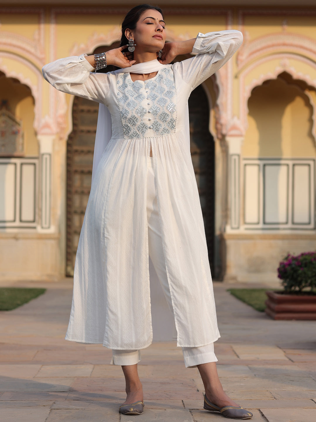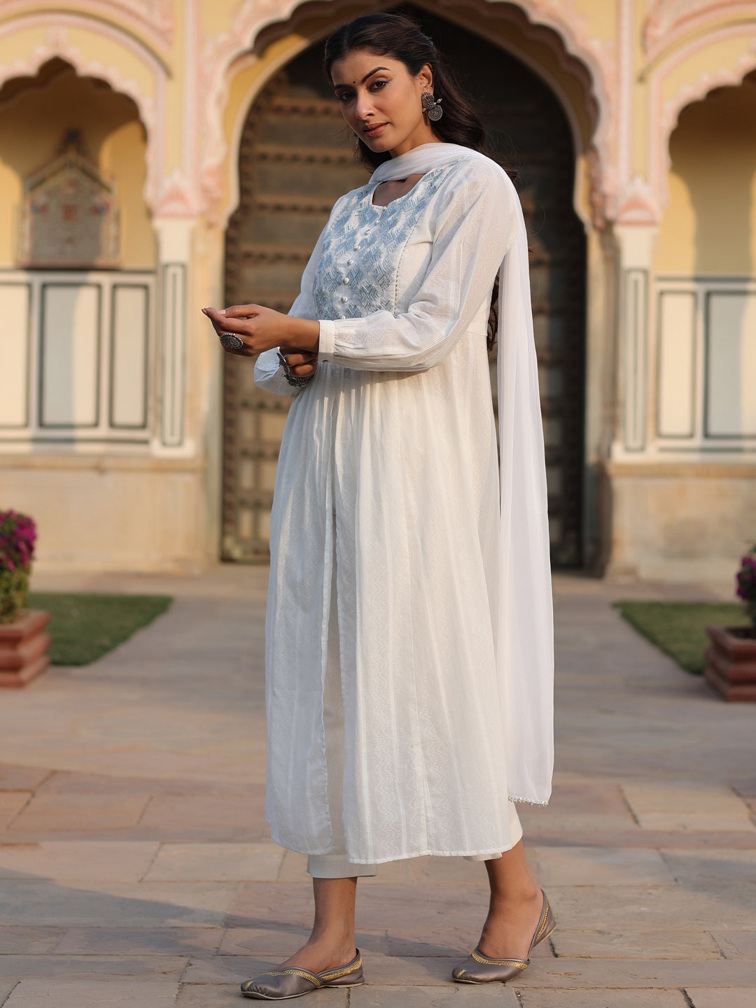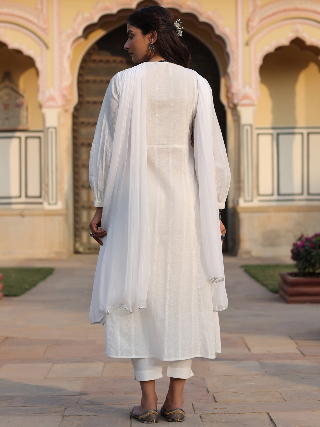 White Cotton Dobby Embroidered Kurta, Pant & Dupatta Set