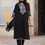 Black Cotton Dobby Embroidered Kurta, Pant & Dupatta Set