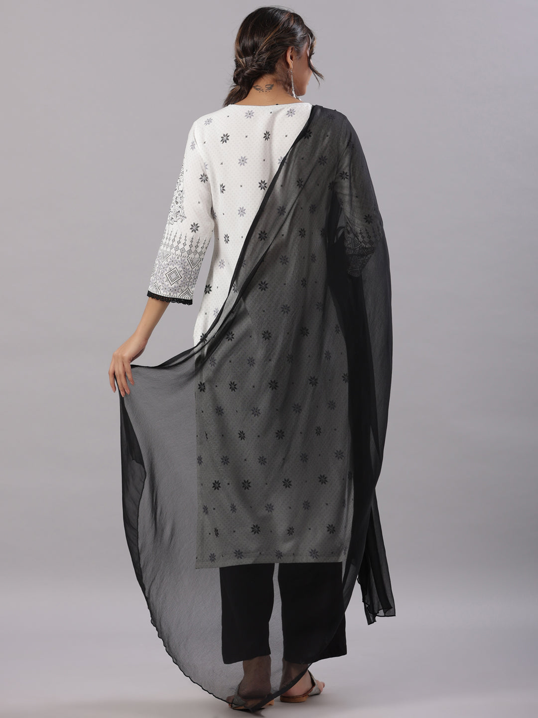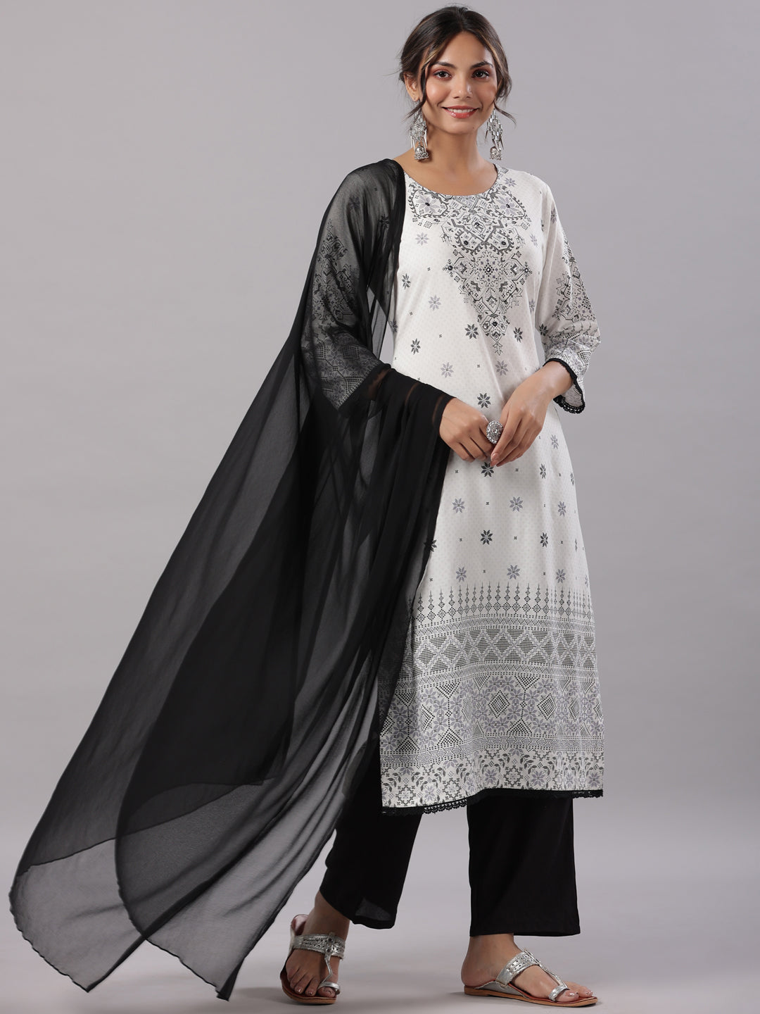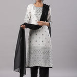 White Rayon Staple Printed Kurta, Pants & Dupatta Set