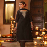 Black Chanderi Printed With Embroidery Kurta, Pants & Dupatta Set
