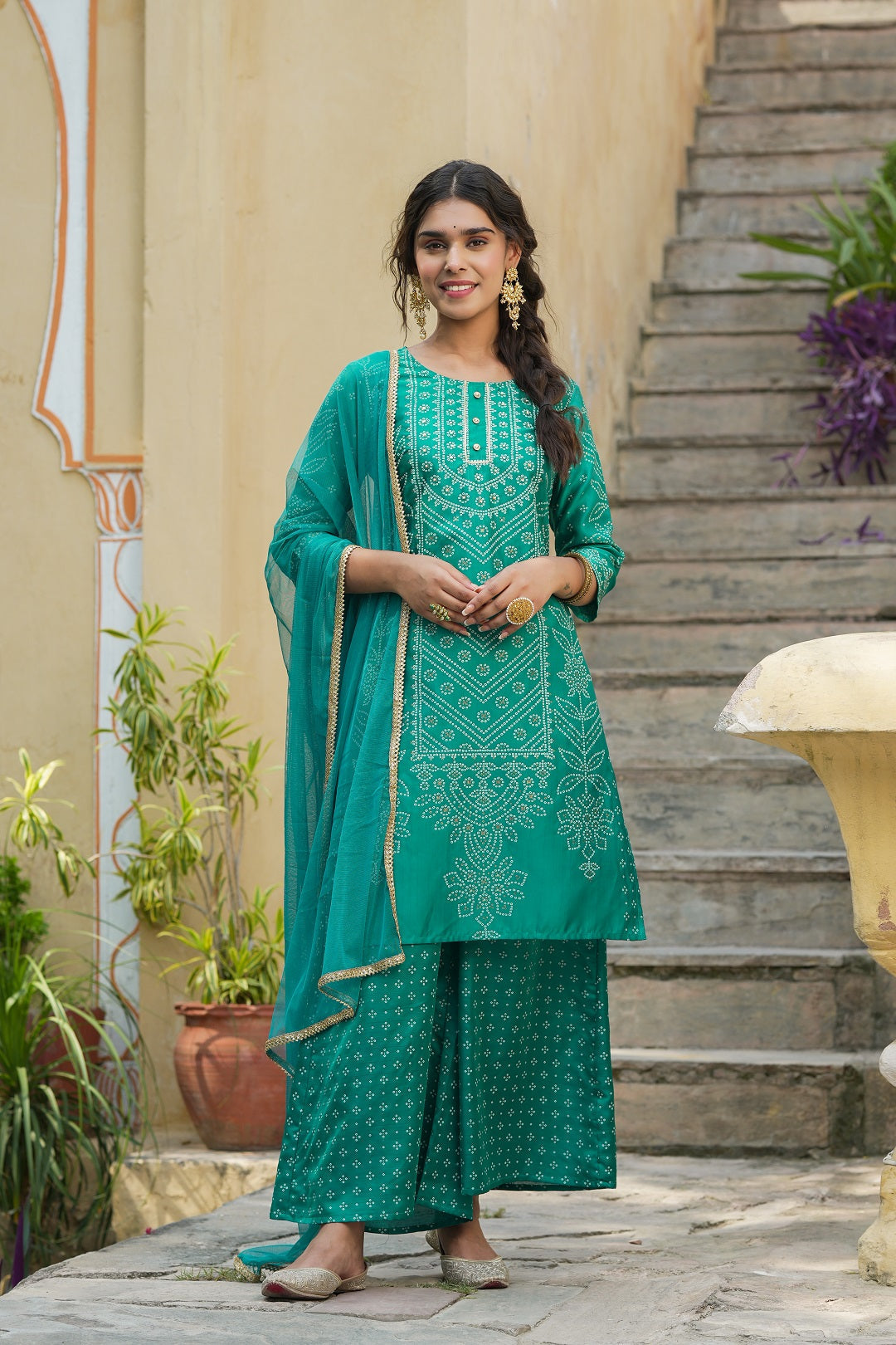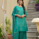 Teal Bandhani Printed Shantoon Kurta Palazzo & Net Dupatta Set With Lace & Beads Work