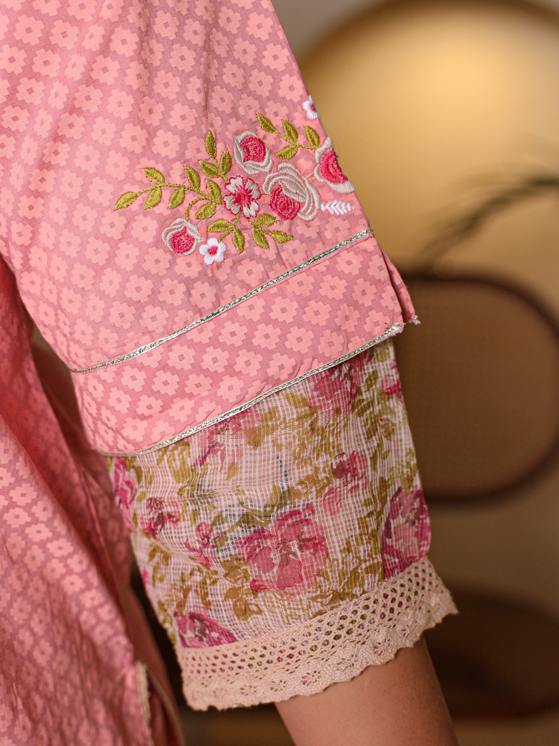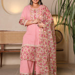 The Madhubala Lime Green Floral Printed & Laced Pure Cotton Plus Size Kurta Palazzo & Dupatta Set With Printed Kota Doria Dupatta