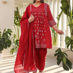 Women Red Ethnic Motif Printed A-Line Cotton Plus Size Kurta Pants & Dupatta Set With Pintucks At Front & Beadwork (3-Pcs)