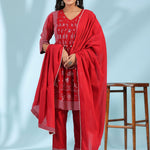 Red Ethnic Motif Printed Cotton Voile Kurta With Pant Dupatta With Pintucks At Front & Beadwork