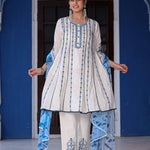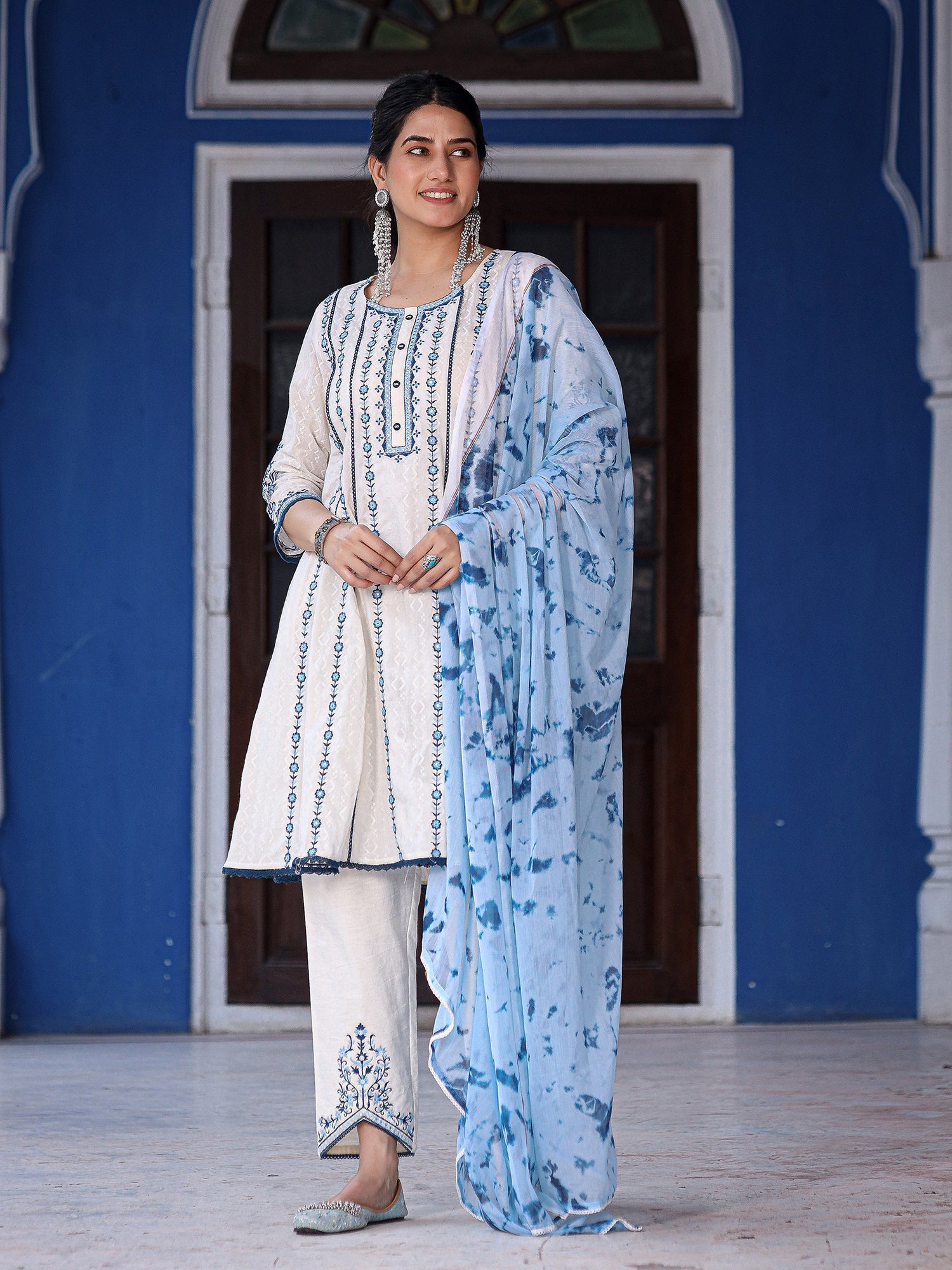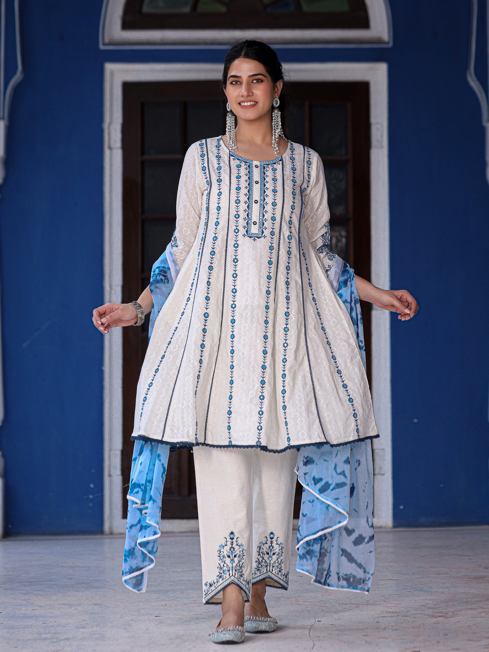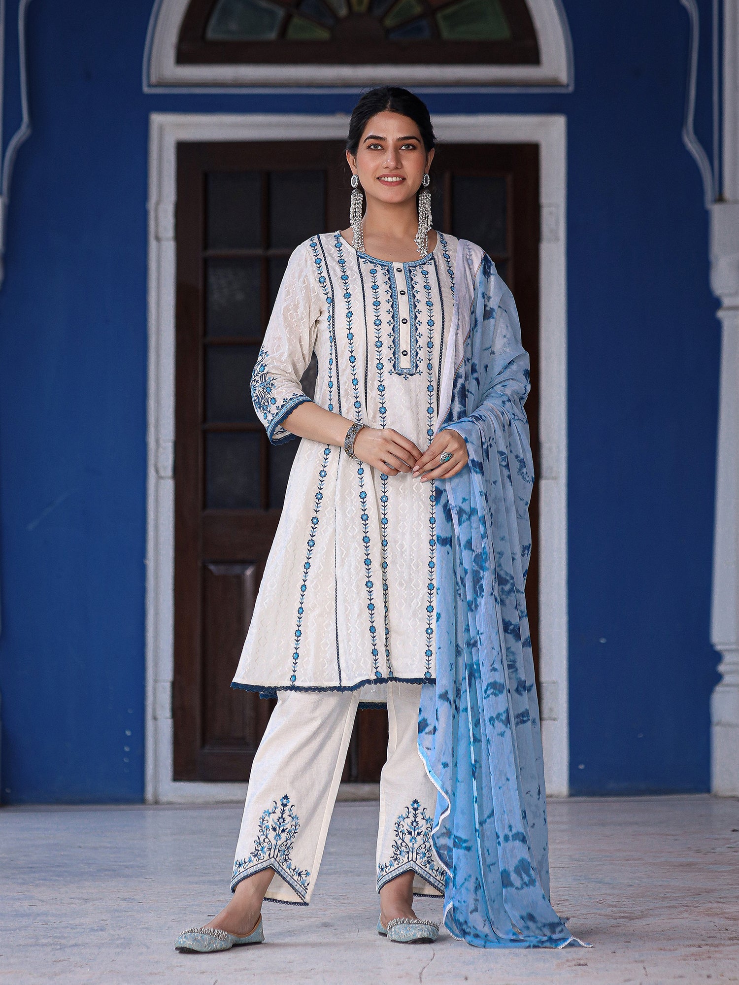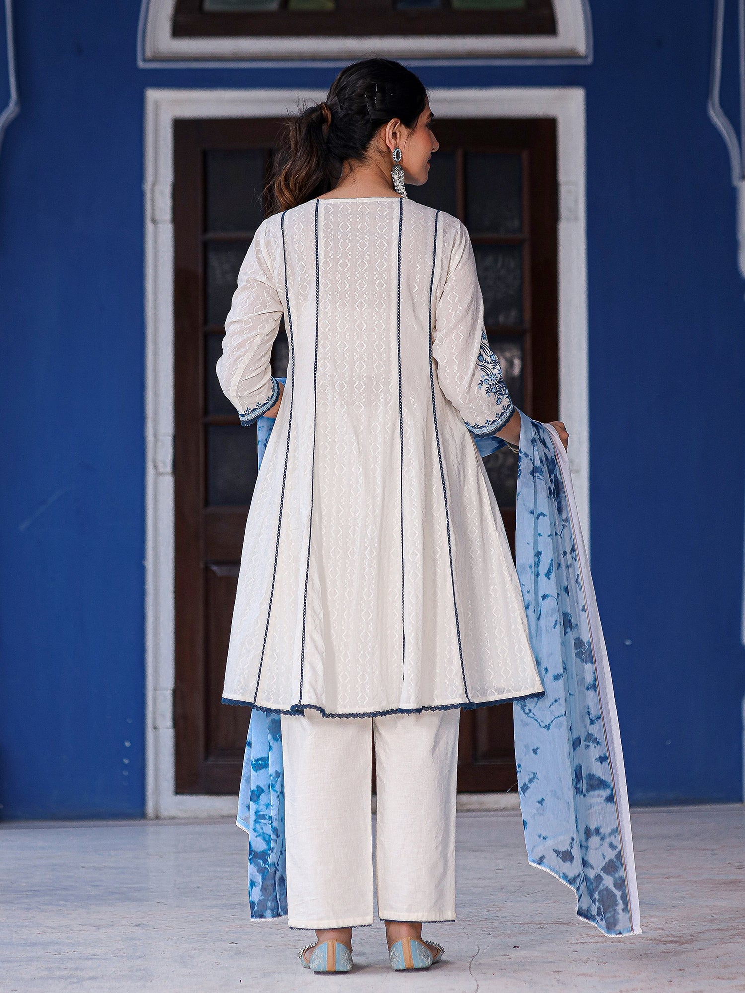 White & Blue Cotton Dobby Thread Embroidered Kurta With Pants Set With Chiffon Dupatta