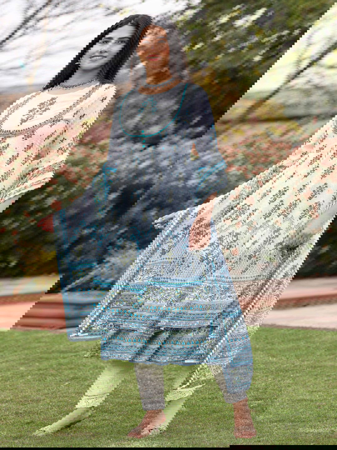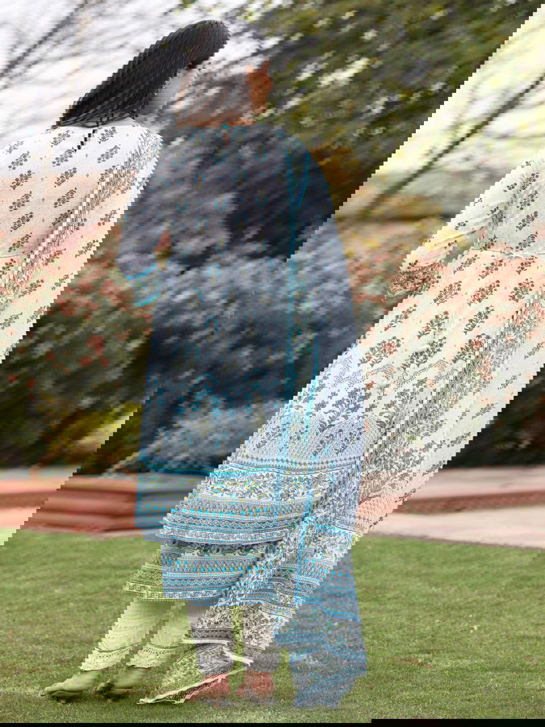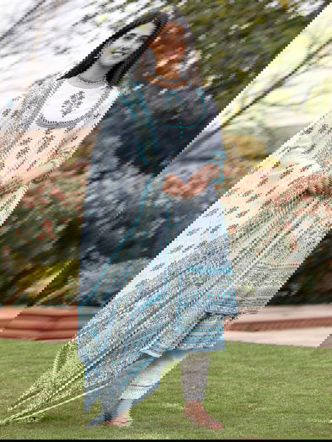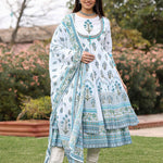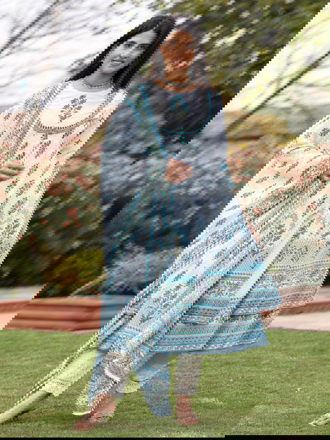 Ethnic Motif Print Cotton Cambric Anarkali Kurta & Kota Doria Dupatta & Pants With Tread Embroidery