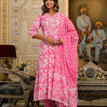 Pink Floral Printed Liva Rayon Kurta Set With Thread & Mirror Work