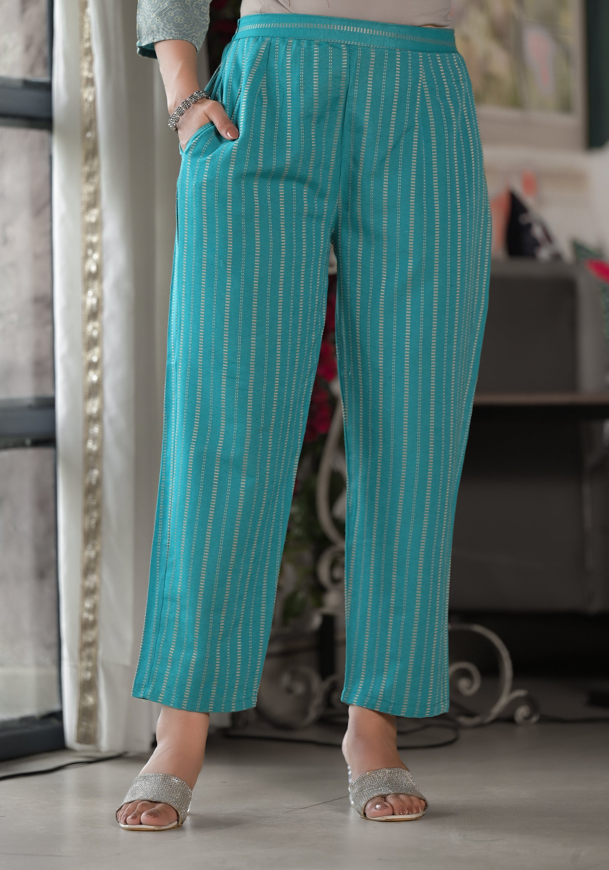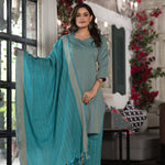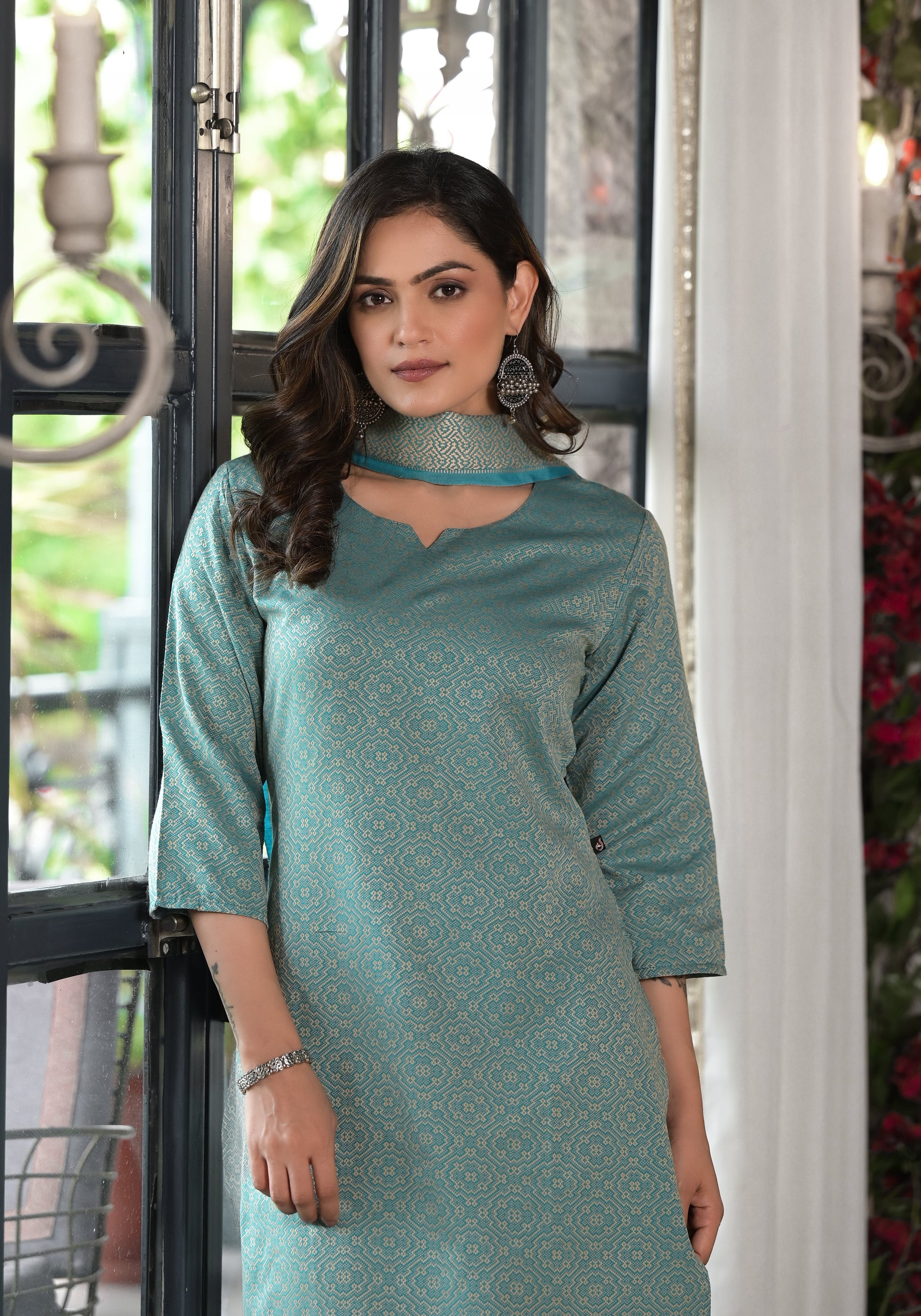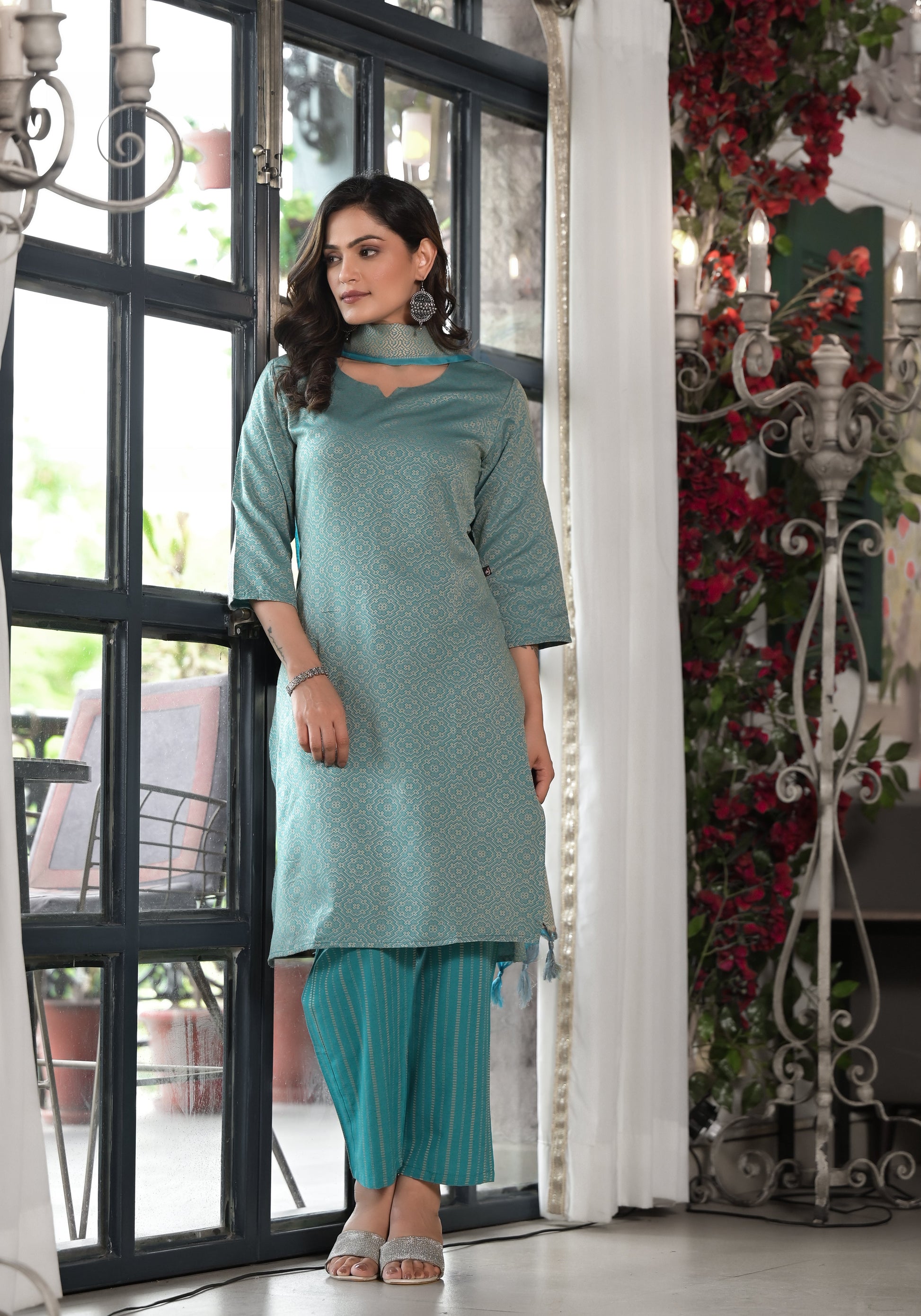 Sky Blue Geometric Printed Cotton Kurta, Pant With Tassels On Dupatta