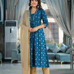 Blue Ethnic Motif Printed Polycotton Kurta Pant And Dupatta Set With Sequins Gota Patti & Beads