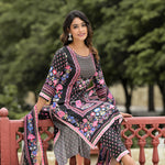 Black Floral Printed Liva Rayon Kurta Pant And Dupatta Set With Tassels & Sequins