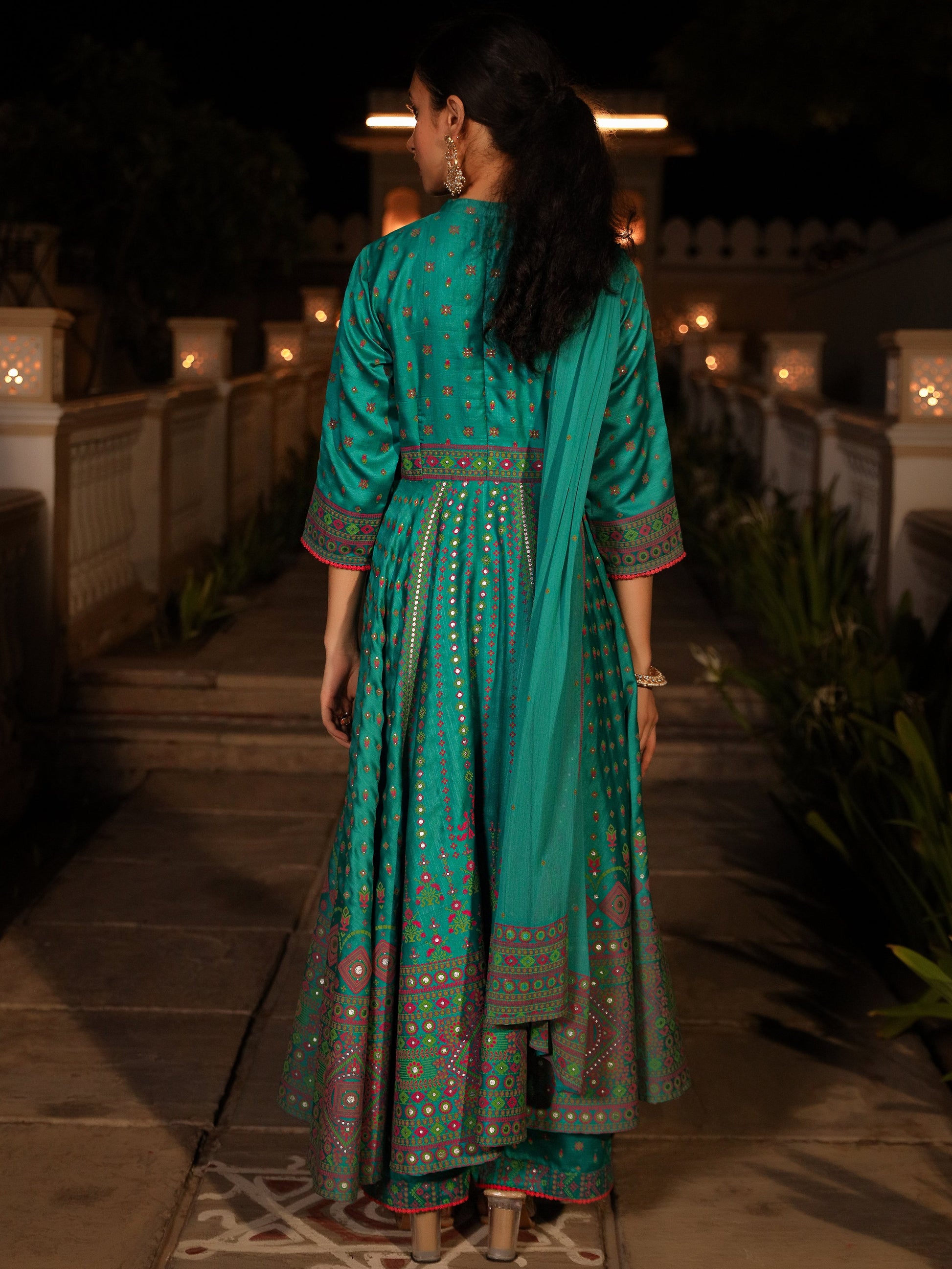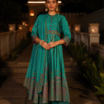 Sea Green Ethnic Motif Printed Slub Satin Kurta Pant And Chiffon Dupatta Set With Buttons & Lace