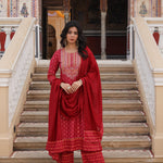 Red Ethnic Motif Printed Polycotton Kurta Pant And Dupatta Set With Thread Zari Work & Sequins