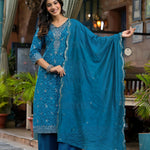 Blue Poly Staple Ethnic Motif Printed Kurta Pant And Dupatta Set With Sequins Mirror & Zari Work