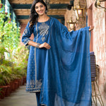 Blue Ethnic Motif Printed Liva Rayon Kurta Pant And Dupatta Set With Sequins & Tassels